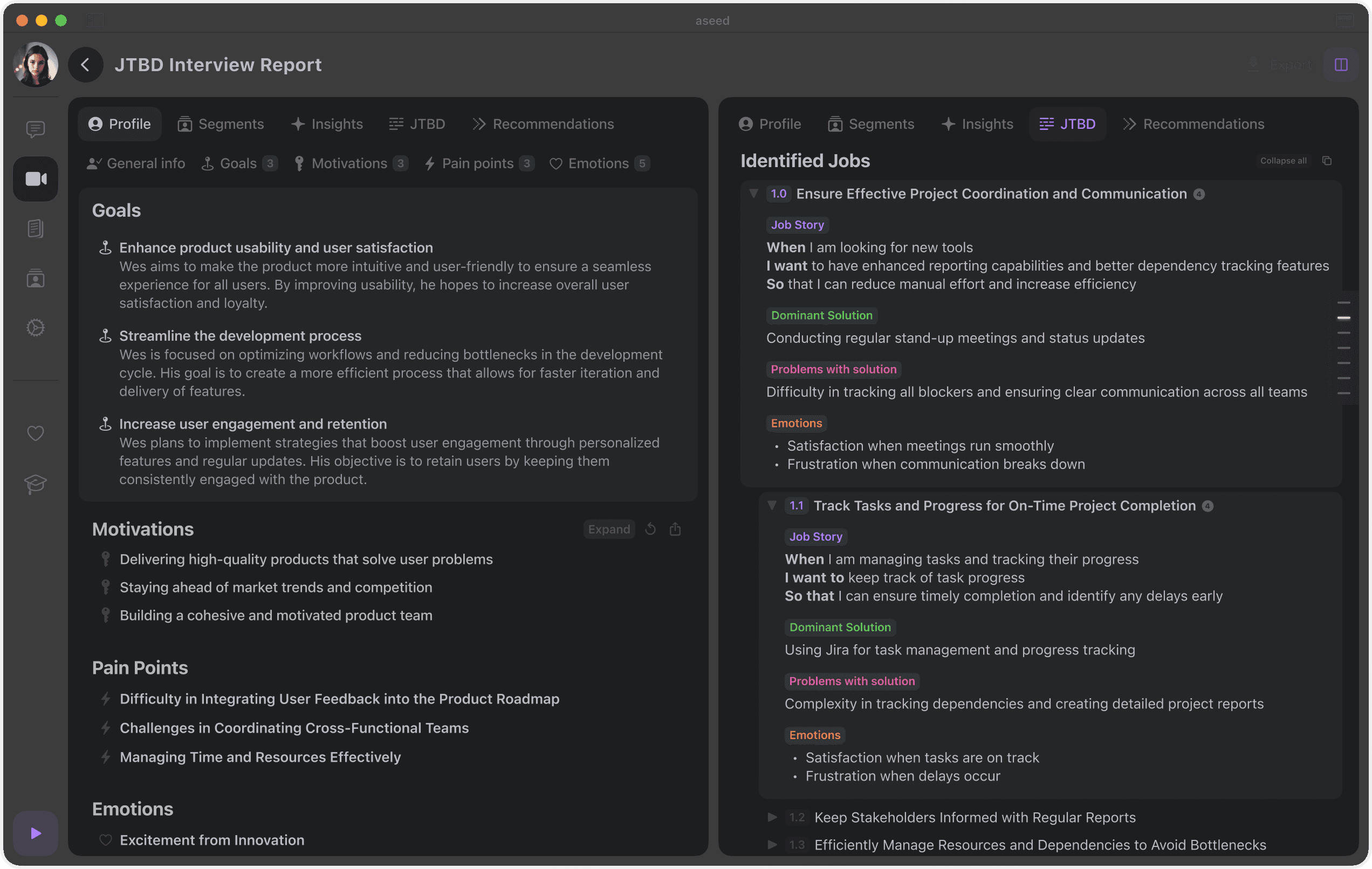 Aseed Insight is an advanced tool for transforming raw interview data into actionable insights in minutes. It automates the analysis process, reducing the time needed to extract meaningful conclusions, and delivers unbiased, well-structured reports that help teams make data-driven decisions faster and with greater confidence.